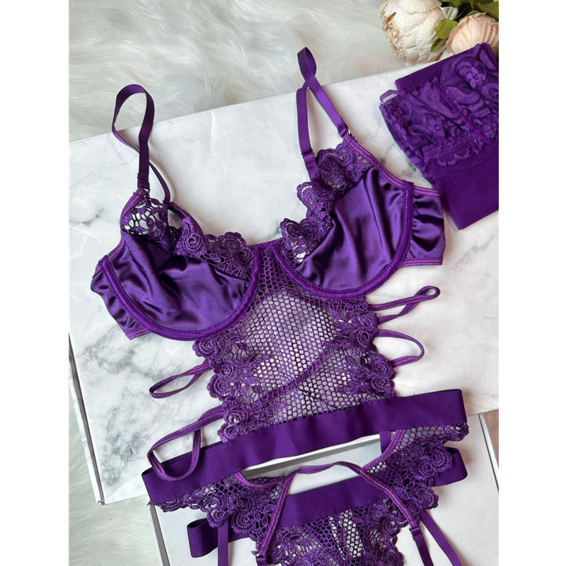 Conjunto de lencería de uva morada, sujetador push-up sexy transparente con medias