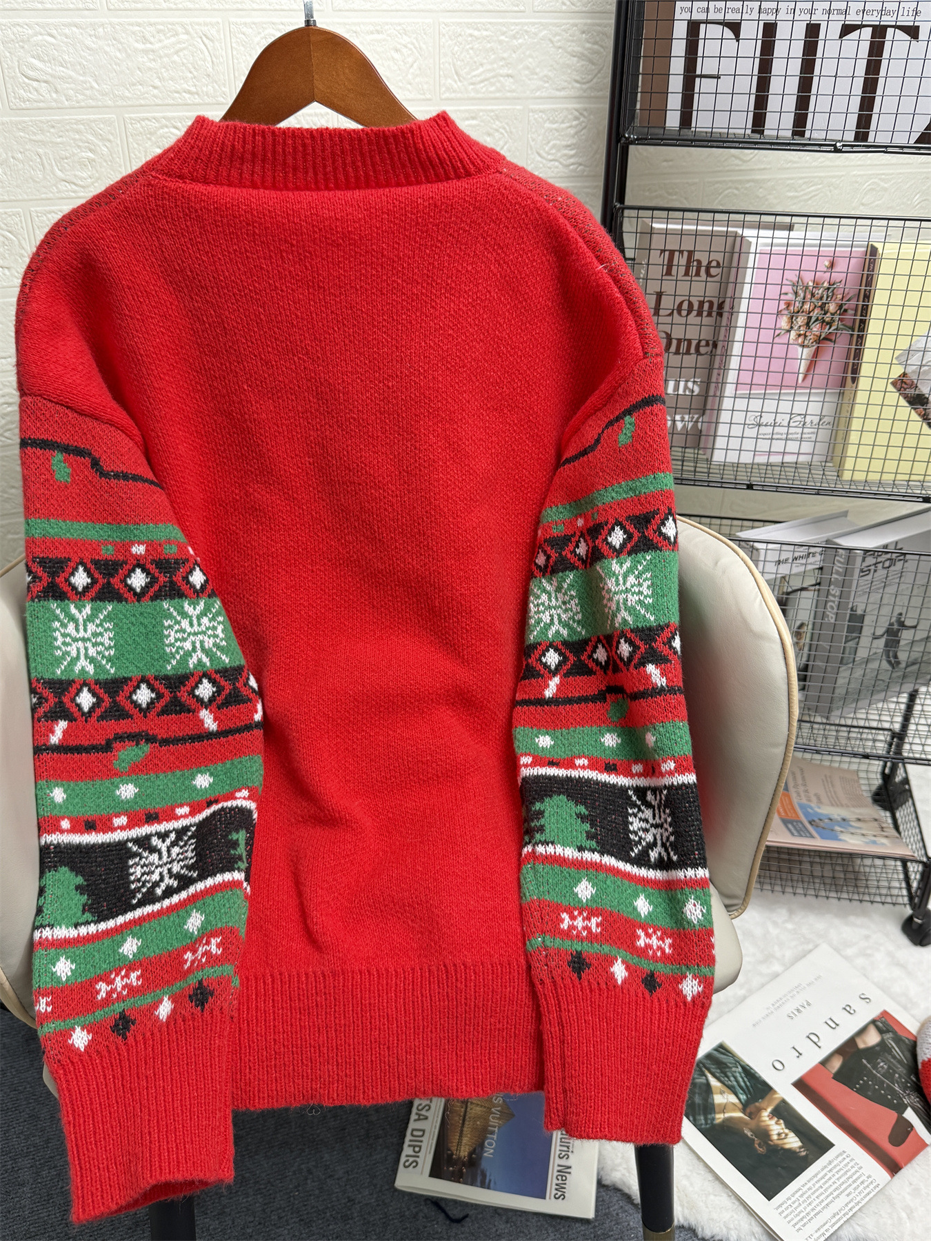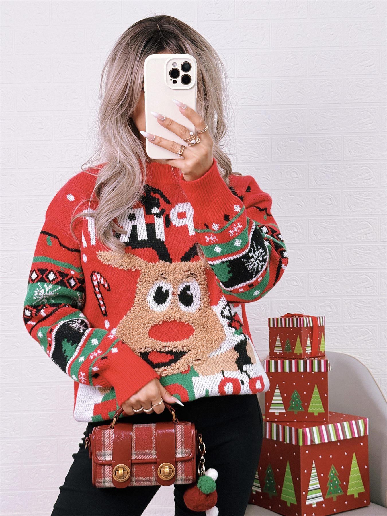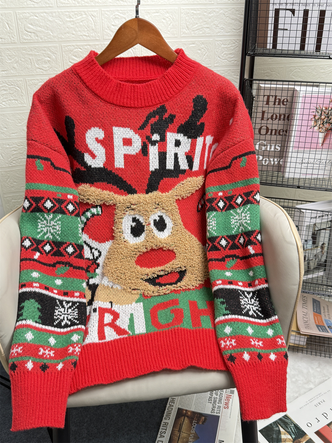 Cartoon Deer Knitted Sweater Round Neck Color Contrast Warm Loose Women's Sweater