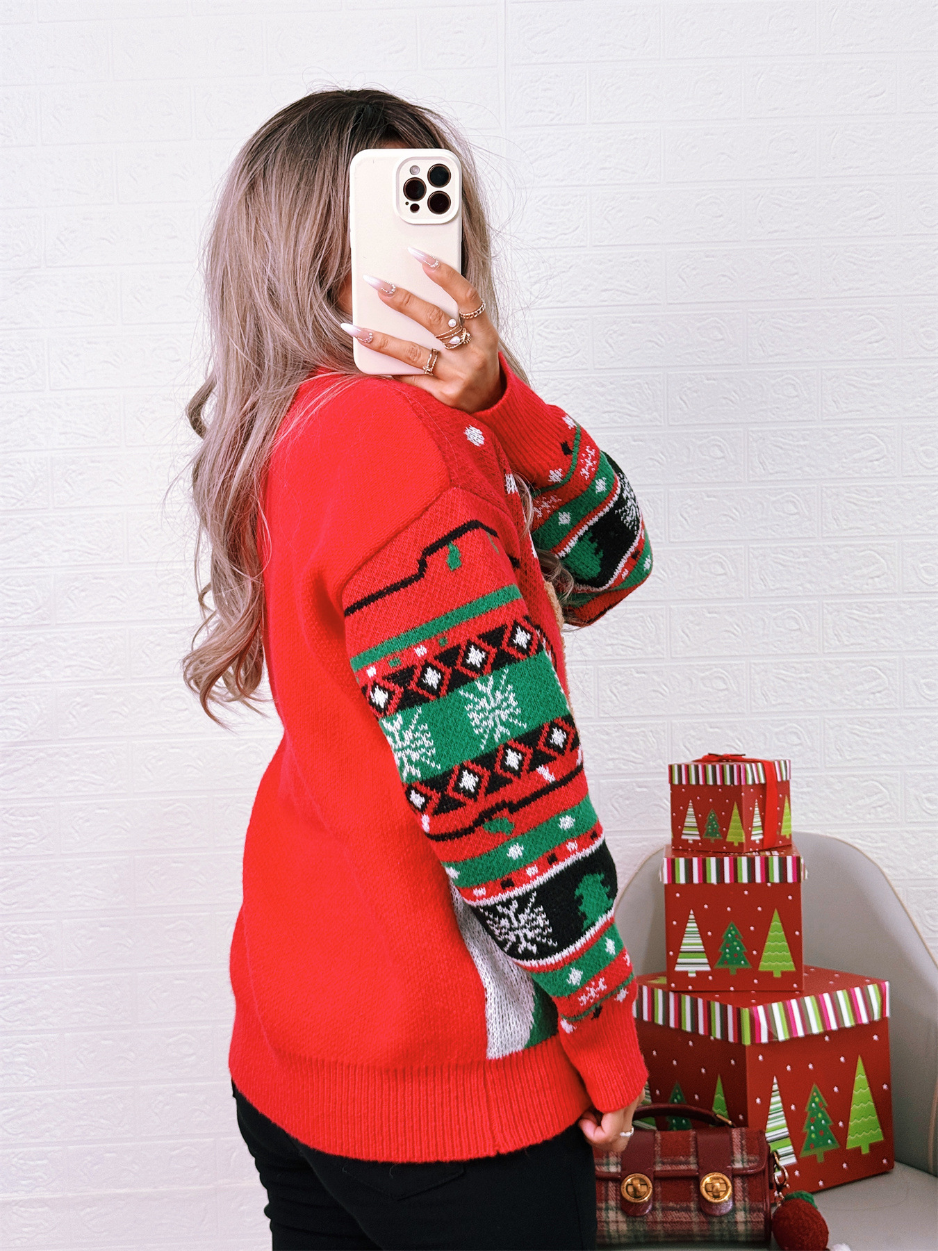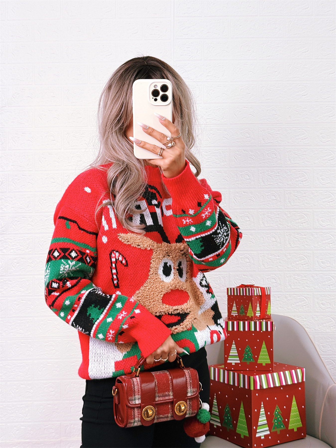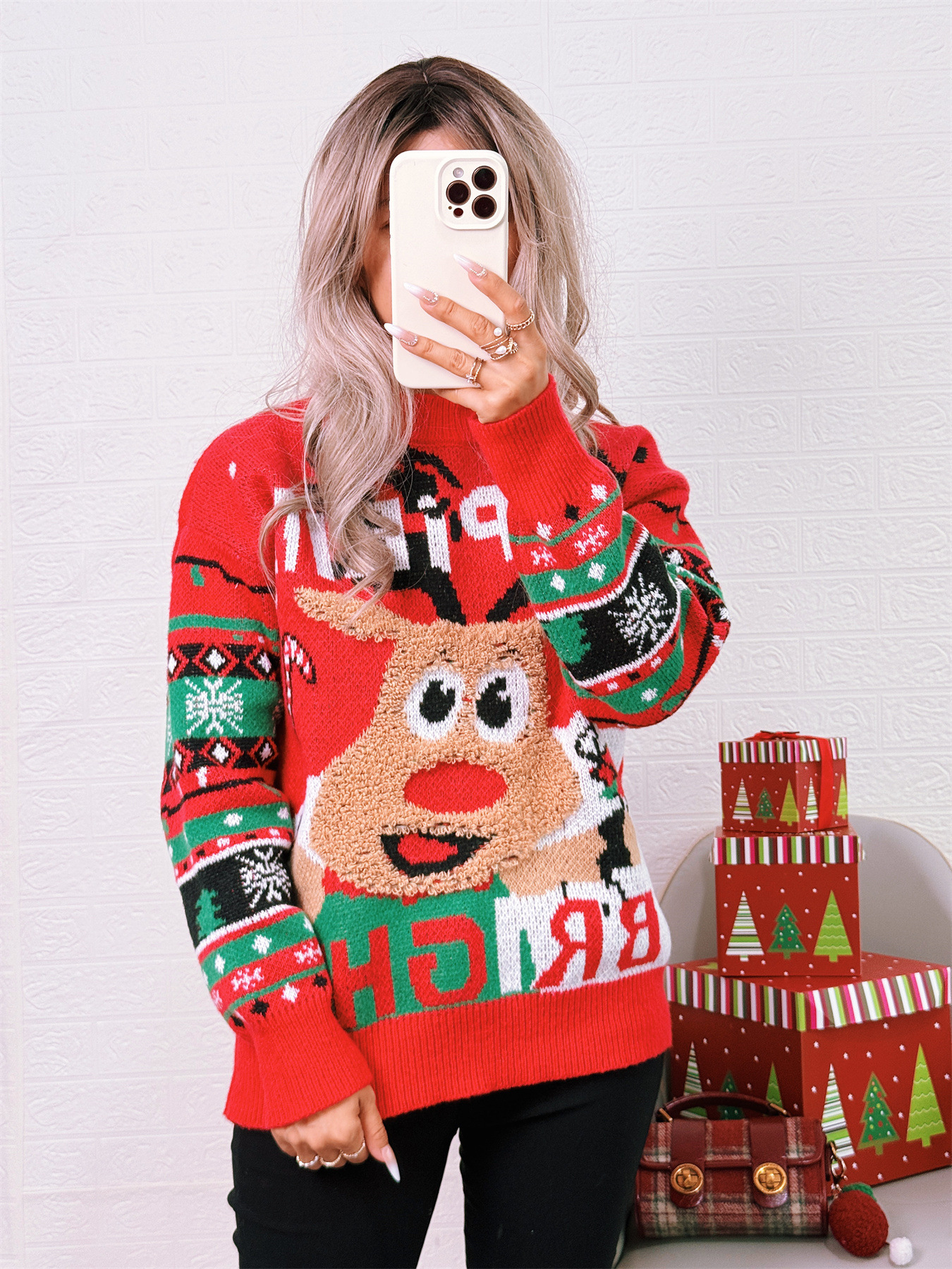 Cartoon Deer Knitted Sweater Round Neck Color Contrast Warm Loose Women's Sweater