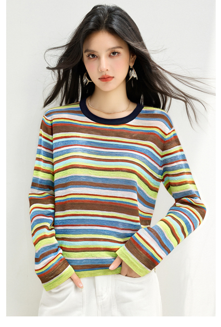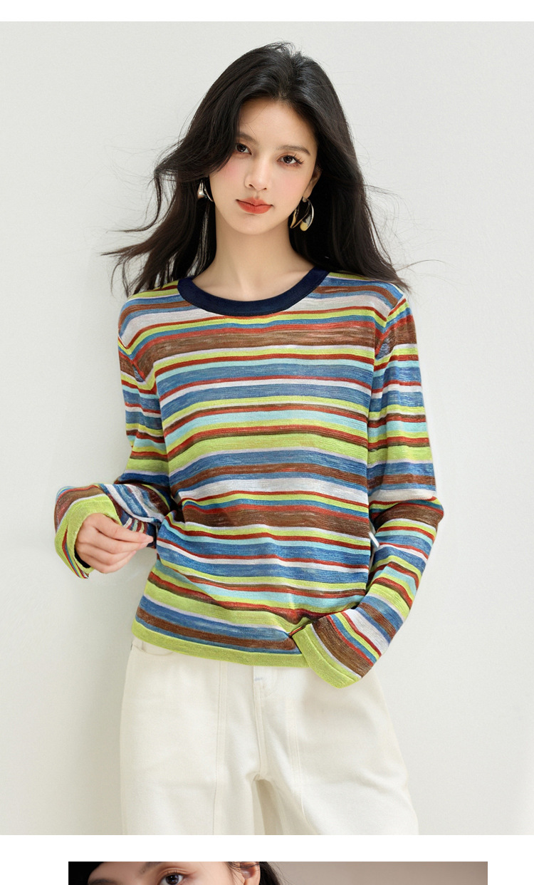 Design Sense Casual Colorful Stripe Crew Neck Knit Top for Women, Autumn Versatile Slimming Retro Basic T-Shirt