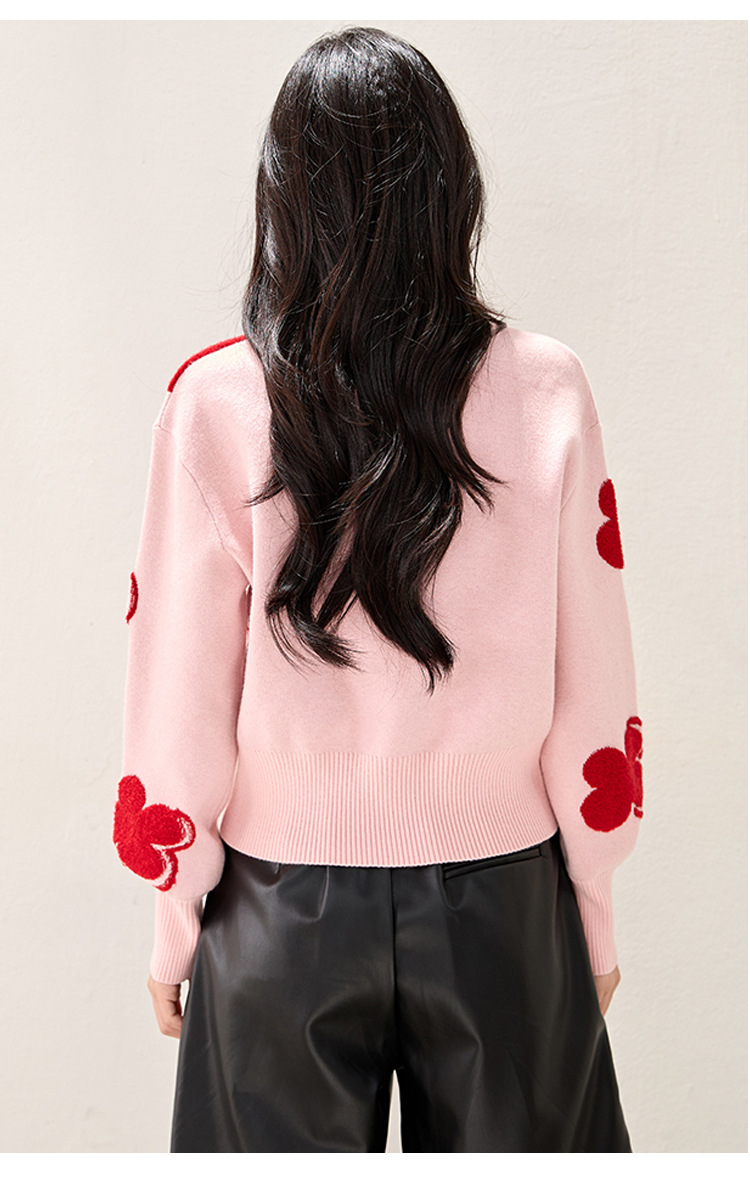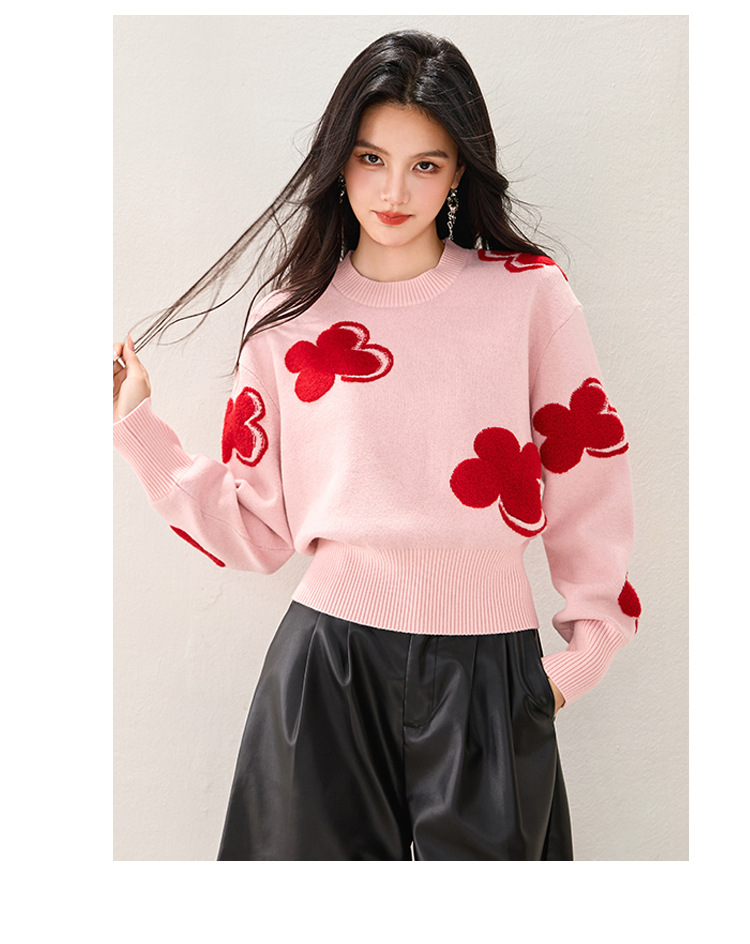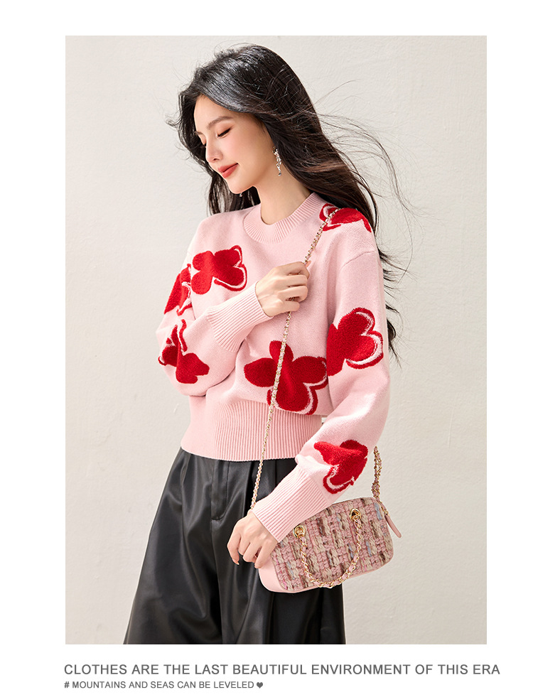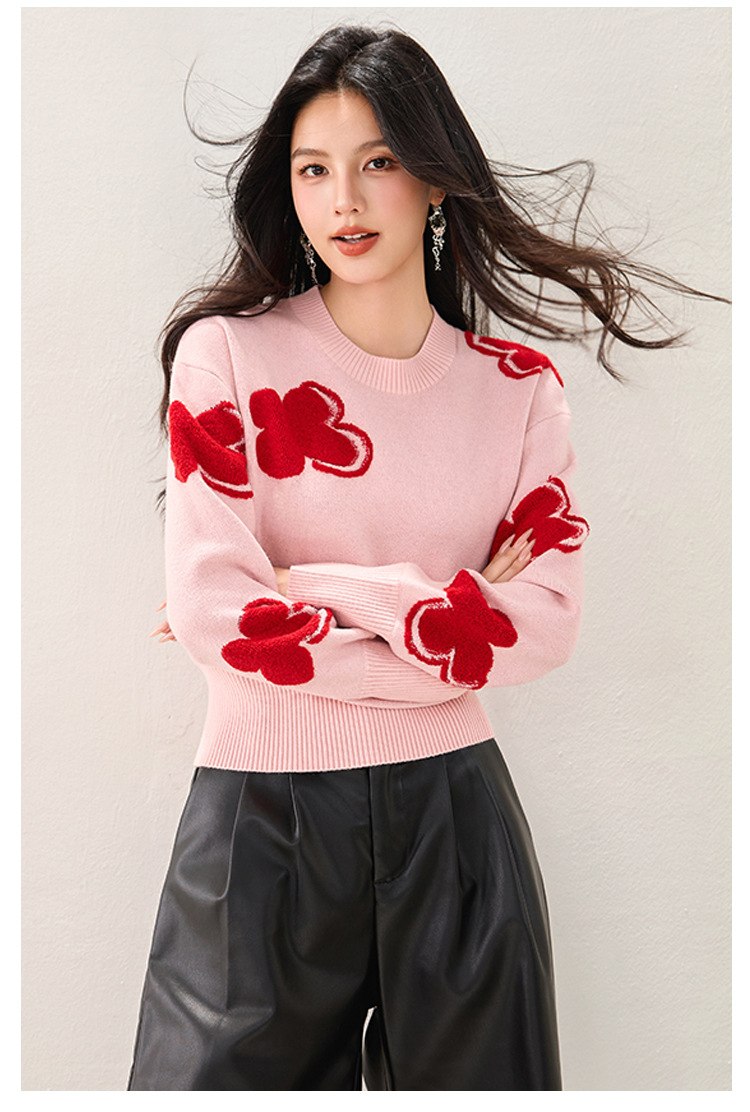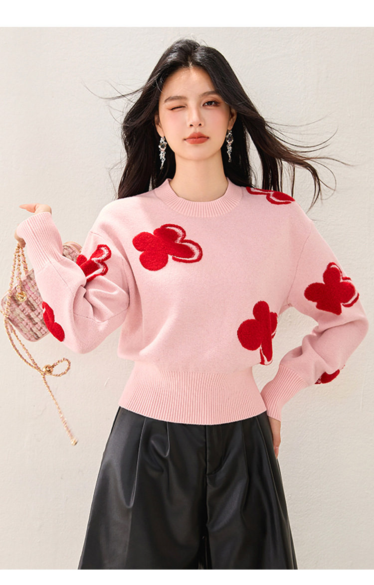 Fashion Color-Blocking Tweed Floral Jacquard Round Neck Knit Top, Stylish and Slim-Fitting Casual Wear