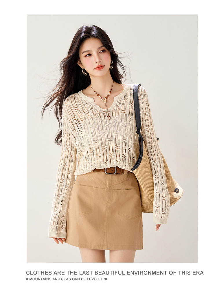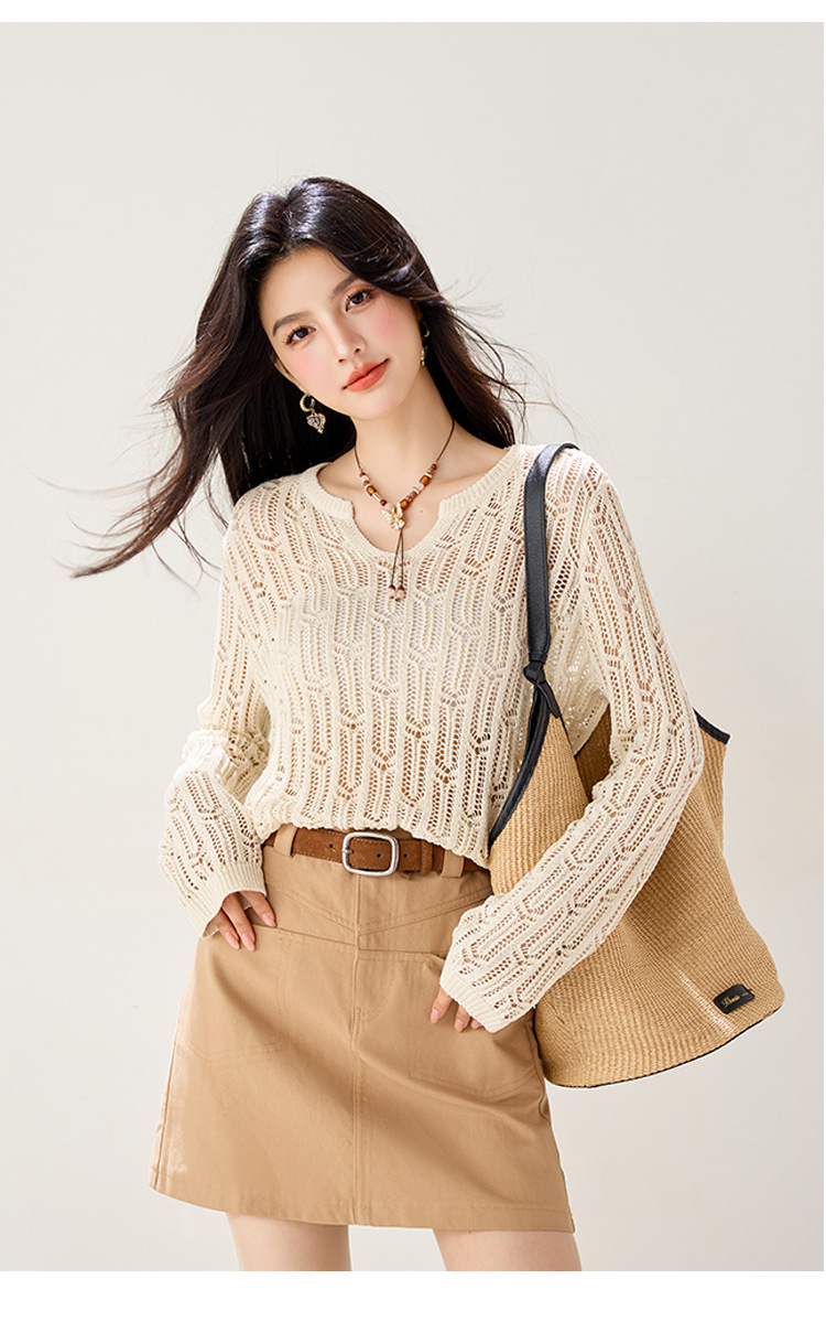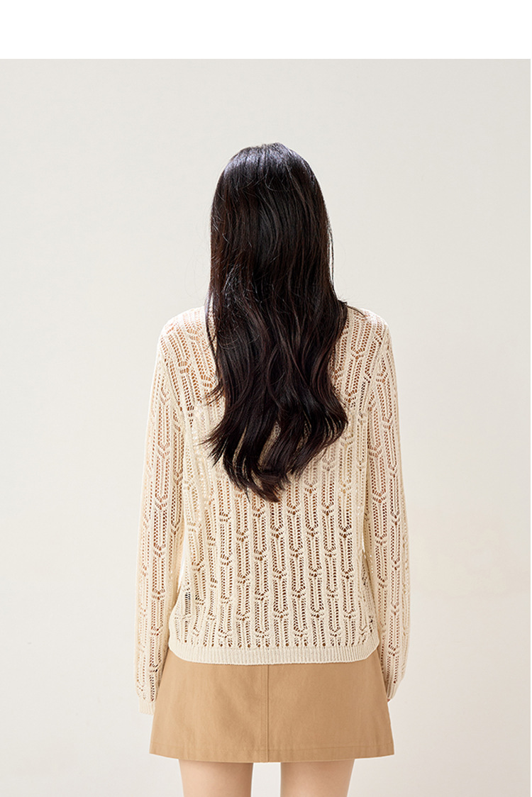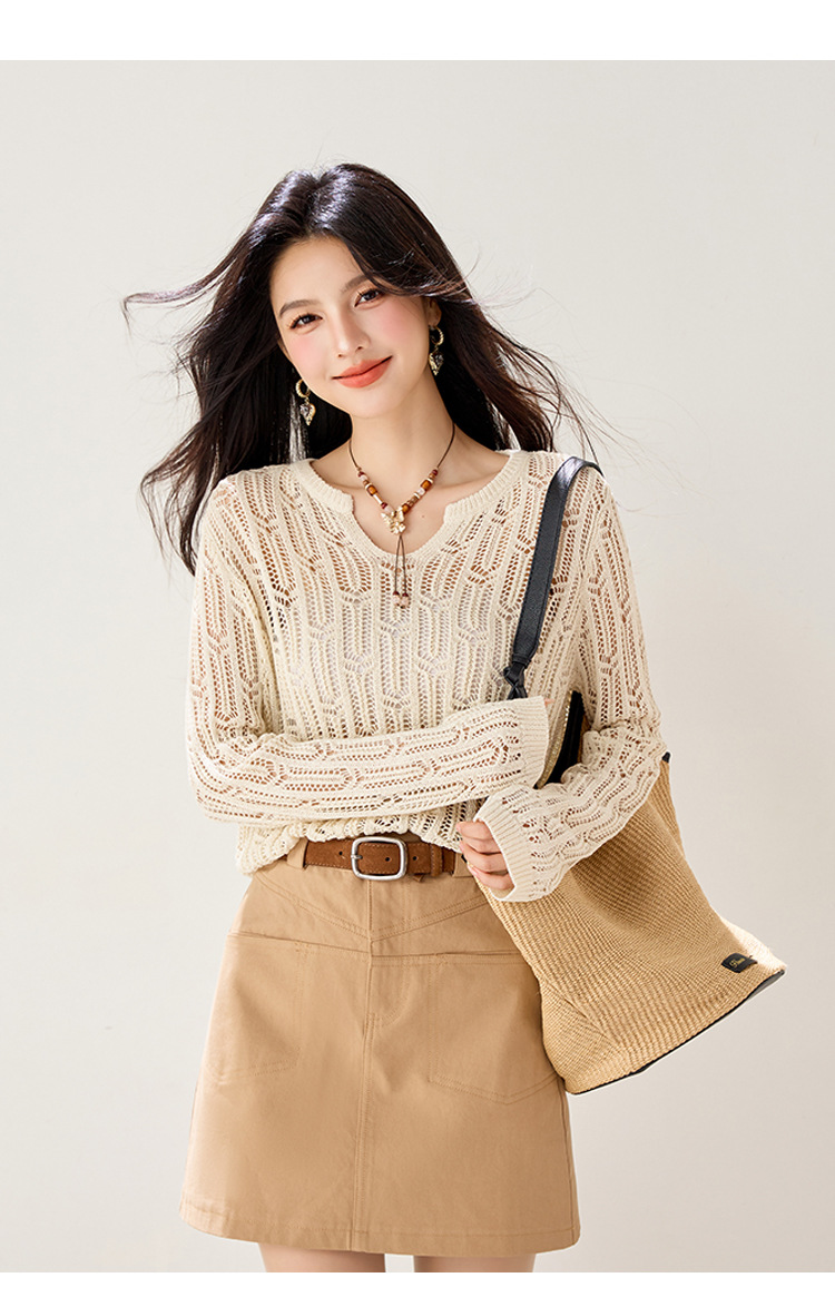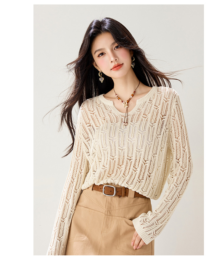 French-style Solid Color Knit Sweater, Loose Fit, Long Sleeve, Breathable, Hollow-out Design, Fashionable Casual Layering Top, Comfortable