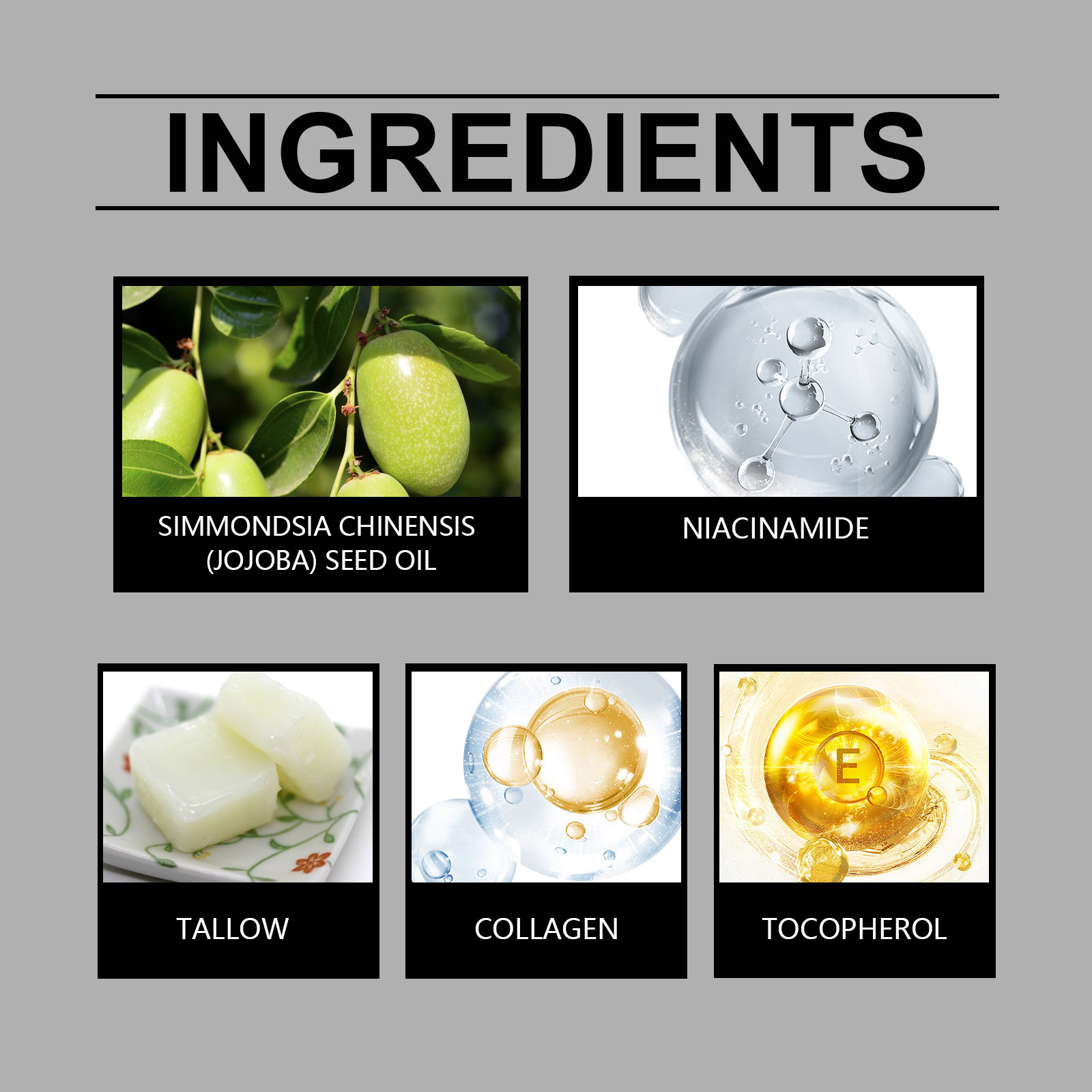Our men's facial butter contains collagen, niacinamide. It can penetrate into the bottom layer of the skin, providing rich nutrients and helping to enhance skin elasticity. Its use method is very simple: maintain the firmness of your facial skin and keep it dry. Take an appropriate amount of facial cream and apply it evenly to your face. Gently massage to promote absorption. And it can lock water for a long time, prevent water loss, and keep skin hydrated all day long. Suitable for all skin types, gentle and non-irritating, helps relieve tired skin.